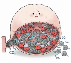 その結果、使い終わった排気ガス(二酸化炭素)が、隅っこにたまって、通路が狭くなり、配達員の赤血球は「積み込み/回収」作業効率が低下し、現場の作業は渋滞しがちになってしまいます。