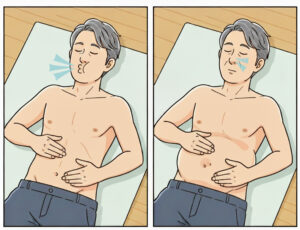 - 手の確認(お腹の動きチェック):片手を胸に、もう片手をおへその少し下(丹田)に当て、胸に当てた手は動かさず、お腹の動きを確認します。