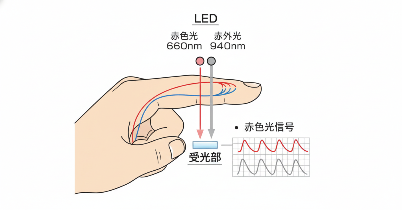 多くの機種は、SpO2(経皮的酸素飽和度)と脈拍数を表示します。通常、指先のセンサーから赤色光と赤外光を当て、ヘモグロビンが吸収する光の違いから割合を推定します。一般的な指クリップ型は、発光部=爪側、受光部=指腹側です。動脈血でどれだけ酸素が運ばれているか(ヘモグロビンと結び付いているか)の割合を推測します。なお、100%を超えることはありません。